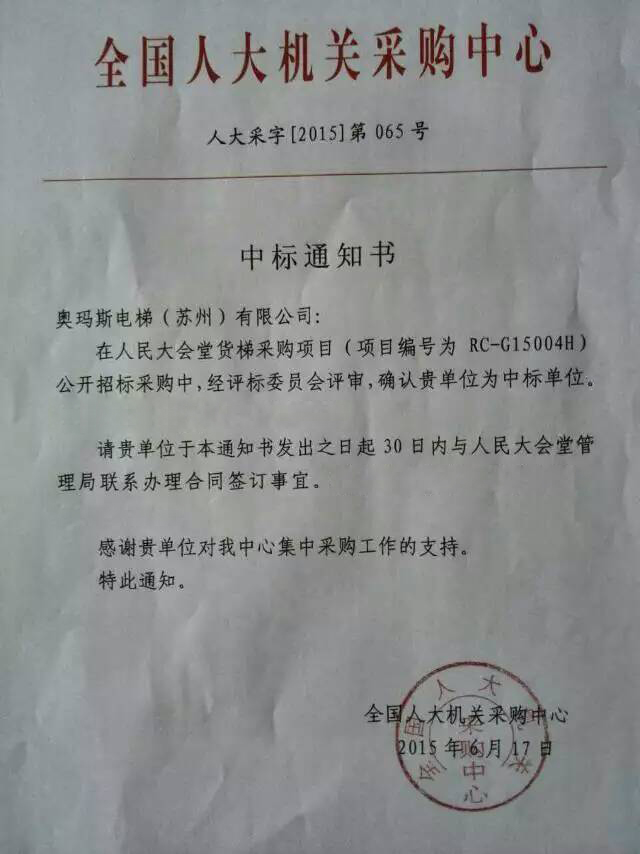 2015年6月17日,對于奧瑪斯電梯公司而言這是一個鼓舞人心的好日子。我們從全國人大機關采購中心獲得最終確認信息:奧瑪斯電梯(蘇州)有限公司在北京人民大會堂1臺4000KG,1.0M/S,5層站載貨電梯(項目編號為:RC-G15004H)的公開招投標活動中一舉獲勝,成功中標 (詳見”中標通知書”) 。