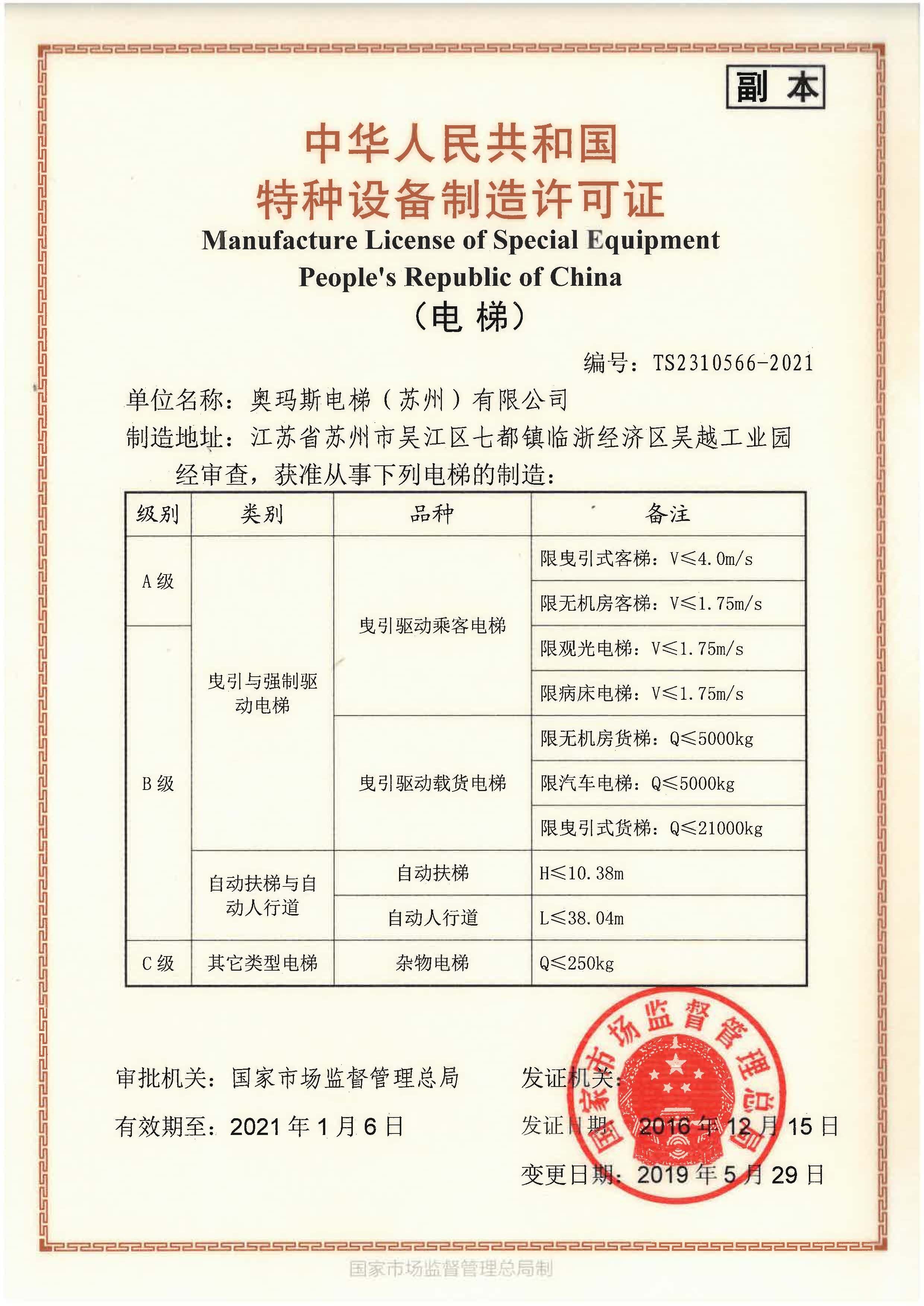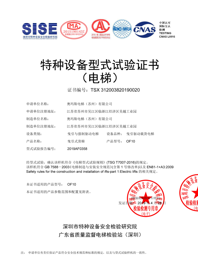 奧瑪斯歷經半年的研發努力,我們在常州地區試制完成21噸超大噸位載貨電梯樣梯的安裝與型式試驗工作,其后順利通過上海交通大學電梯檢測中心的資料評審,終于如期在五月底前獲得新制造許可資格證書!